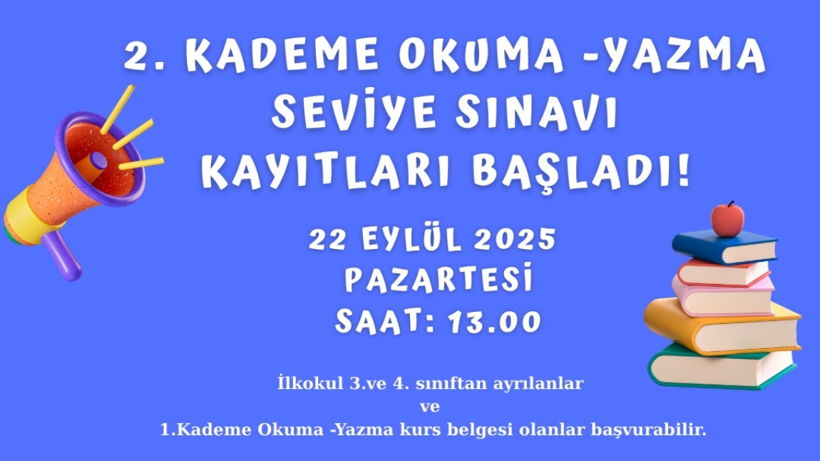 2.KADEME OKUMA YAZMA SEVİYE SINAVI KAYIT BAŞVURUSUBu sınava ilk okul 3.ve 4. sınıftan ayrılanlar ve 1.Kademe Okuma Yazma...